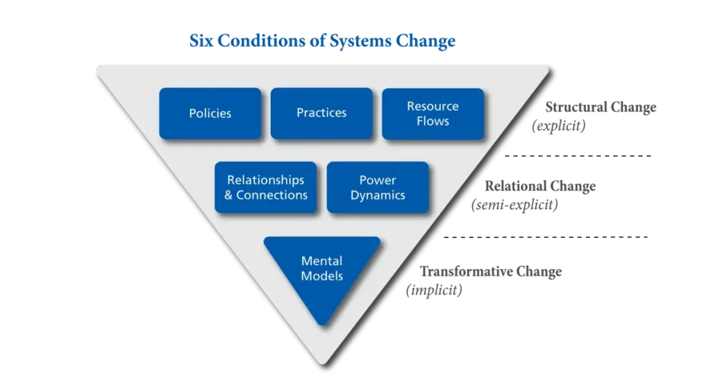 Meadows lists 12 leverage points for restructuring systems. The more recent Water of Systems Change (FSG 2018) offers a streamlined, but similar, approach with 6 elements across 3 levels: