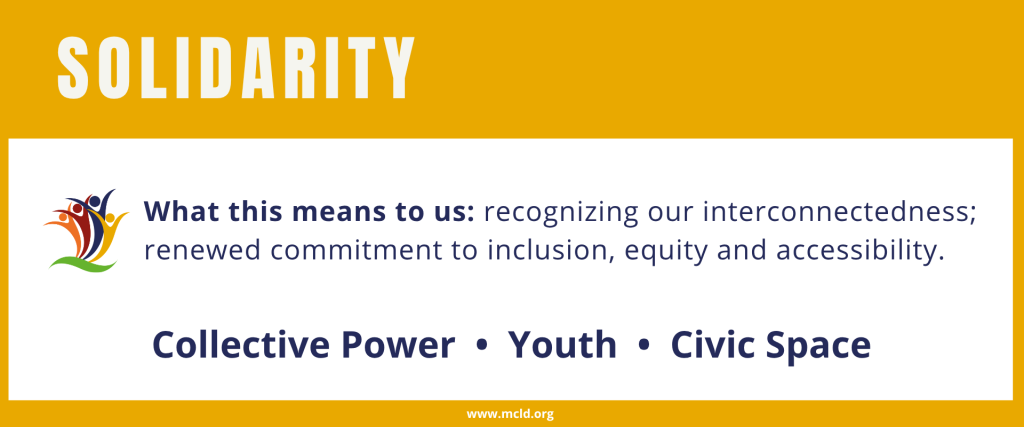 At MCLD, we believe we have the power to transform the world—to ensure peace and prosperity for all people and the planet—if we stand together in radical solidarity. Our strategic plan is not just our response to the world we are in; it is a roadmap to the world we want to create—one that requires each of us, and our collective power.